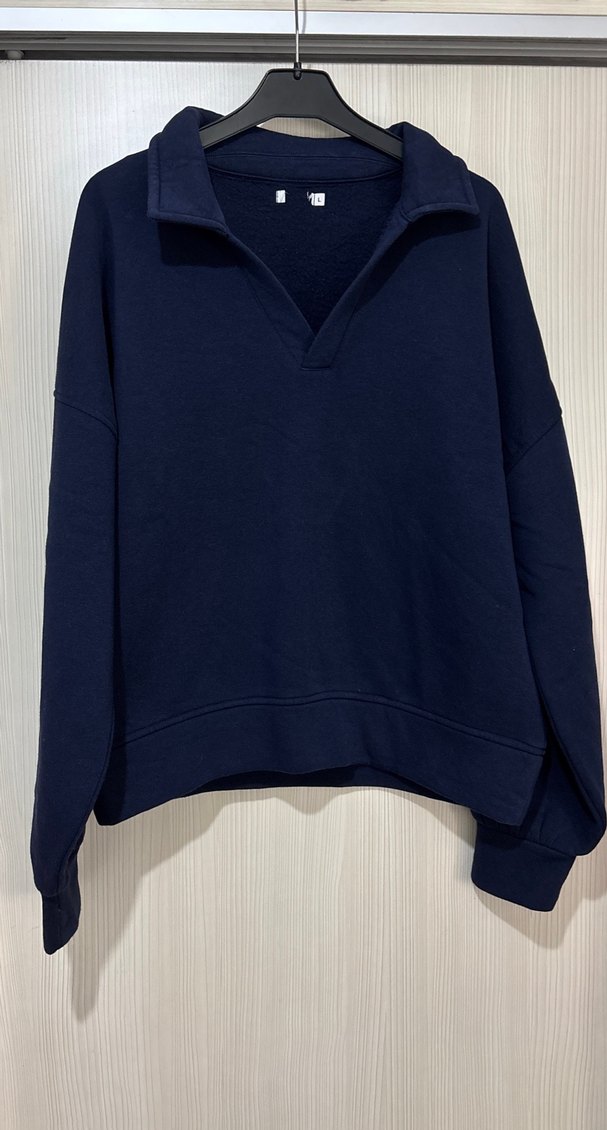 Lacivert kadın sweatshirt, V yakalı ve uzun kollu, yumuşak ve sıcak kumaştan. Rahat kesimi ve normal boyu ile gündelik şıklık sağlar. Sıfır ürün bir markaya ait