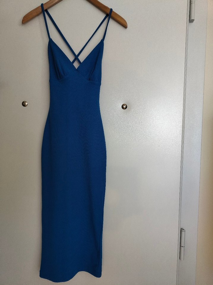Bu kadın elbisesi, lacivert renkte, V yakalı ve ince askılıdır. Uzun boyu ve drapeli tasarımı, çağdaş ve minimalist bir stil sunar.