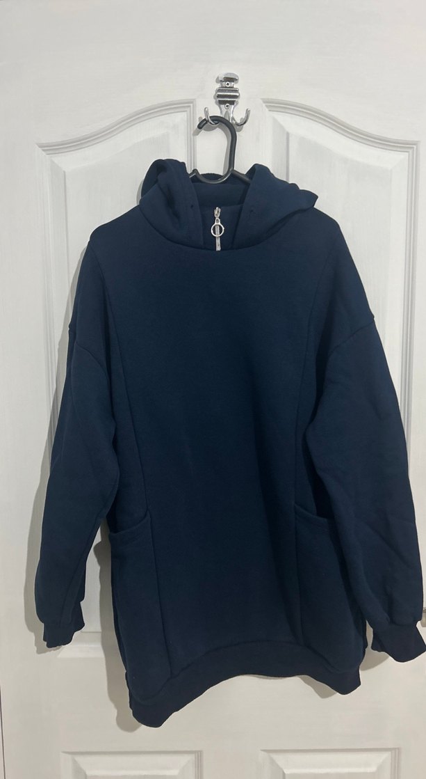Yarım fermuarlı, yüksek yakalı, uzun kollu ve bol kesim kadın sweatshirtü. Yumuşak ve sıcak kumaştan üretilmiş, günlük kullanıma uygun koyu lacivert renkte.