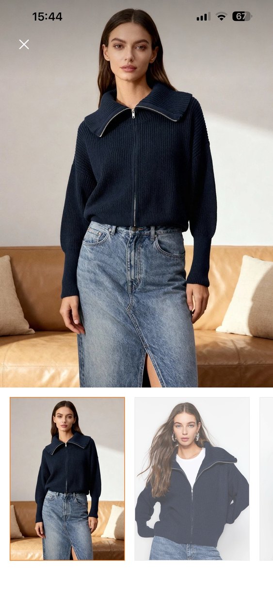 Lacivert renkli, yarım fermuarlı, yüksek yakalı ve uzun kollu triko kazak. Rahat kesimiyle gündelik kullanıma uygundur.