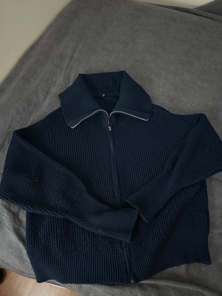 Yarım fermuarlı, yüksek yakalı, uzun kollu, yumuşak yünden örülmüş, normal midi boyda, lacivert renkte kadın kazak.
