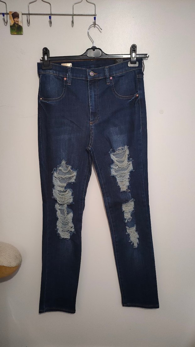Kadınlar için koyu lacivert denim pantolon, bol kesim ve tokalı detaylara sahip. Midi boy, yırtık desenli ve günlük sokak stili için uygun.