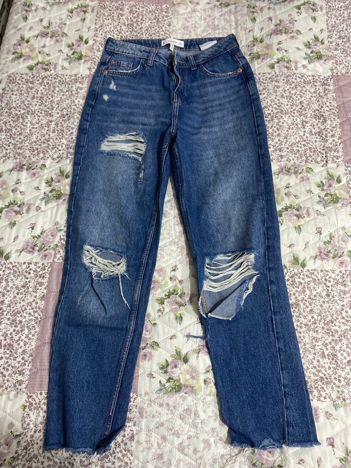 Lacivert renk, midi boy, bol kesim kadın kot pantolon. Yırtık detaylarıyla günlük ve rahat sokak stili için uygundur.