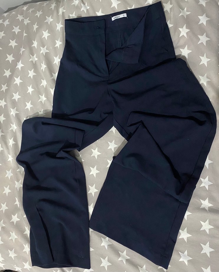 Kadınlar için koyu lacivert, midi boy, rahat kesim ve ipeksi kumaştan yapılmış pantolon. Günlük iş kullanımı için zahmetsiz şıklık sunar. Çok az giyildi ✨
