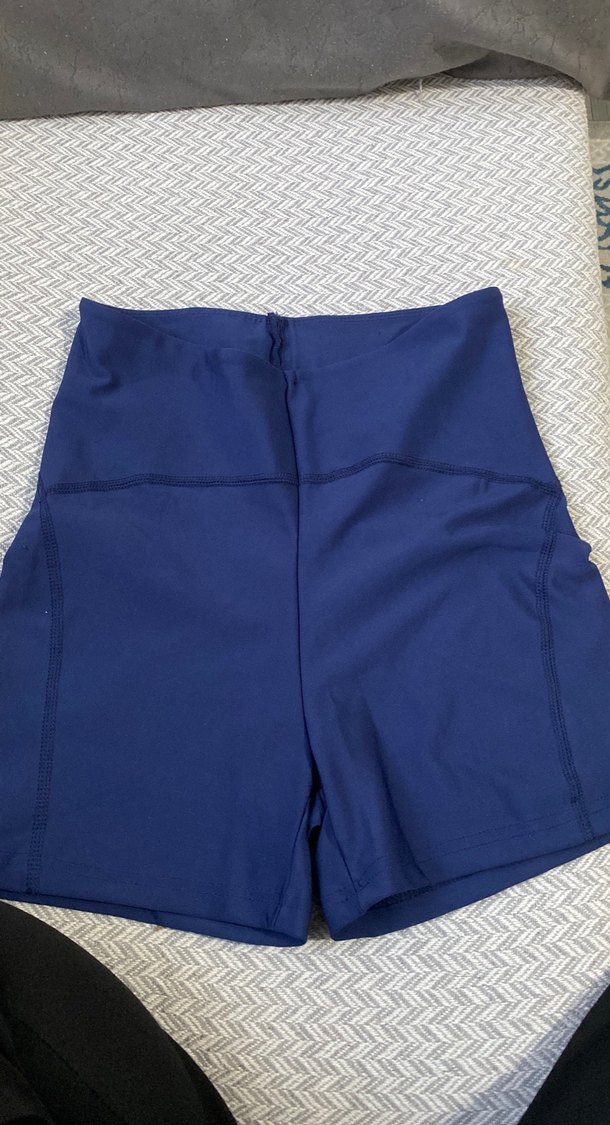Kadınlar için yüksek bel, lacivert midi uzunlukta, düz ve sentetik kumaştan yapılmış spor şortu. Rahat ve şık bir görünüm sunar. ♀️