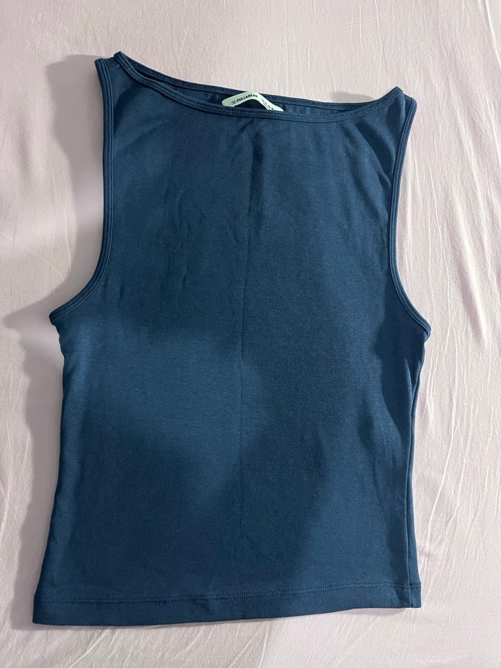 Lacivert renkte, yüksek yakalı ve kolsuz, vücuda oturan kadın atlet. Düz ve sentetik kumaştan, günlük sokak stili için uygun.