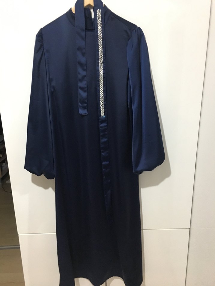 Lacivert, yüksek yakalı ve uzun kollu bu uzun elbise, dökümlü tasarıma sahip. İpek gibi kumaştan üretilmiş, klasik ve zarif bir görünüm sunar, özel gün ve normal zamanlar için kullanıma uygundur. Normal kesim ve parlak yüzeyidir