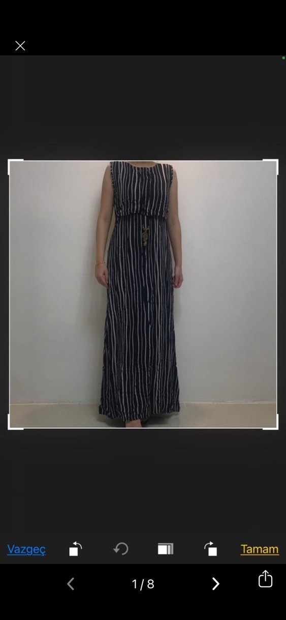 Lacivert renkli, kolsuz uzun elbise, zebra desenli ve kayık yaka detaylıdır. Belden kemerli, rahat kesimdir.