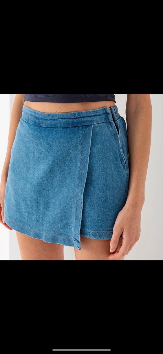 Mavi pastel renkli mini denim şort etek, lastikli bel ve yandan fermuarlı, rahat ve salaş kesimle günlük sokak stili için uygun.