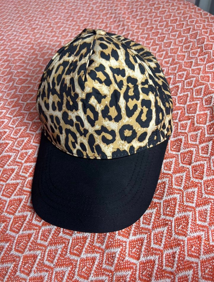 Sentetik kumaştan yapılmış, leopar desenli koyu kahverengi kadın şapka. Siyah vizörlü ve ayarlanabilir Velcro bantlı.