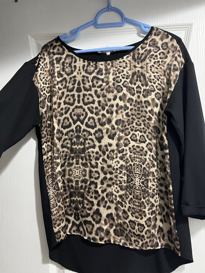 leopar desenli,yuvarlak yakalı, bol kesim bluz. Oversize. Sayılı giyildi etiketi kısmı kesik ama H&M markadır şifon tarzı kumaştır yaka kısmında hafif iplenme var başka bir sıkıntısı yoktur