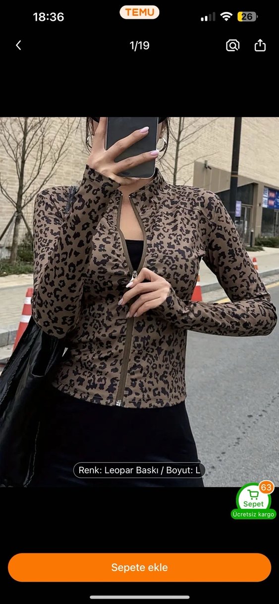 Dar kesim kadın ceketi, yüksek yakalı ve uzun kolludur. Koyu kahverengi leopar desenlidir, kısa boylu ve fermuarlıdır. Günlük kullanım için uygundur. Çok esnek kumaşı var