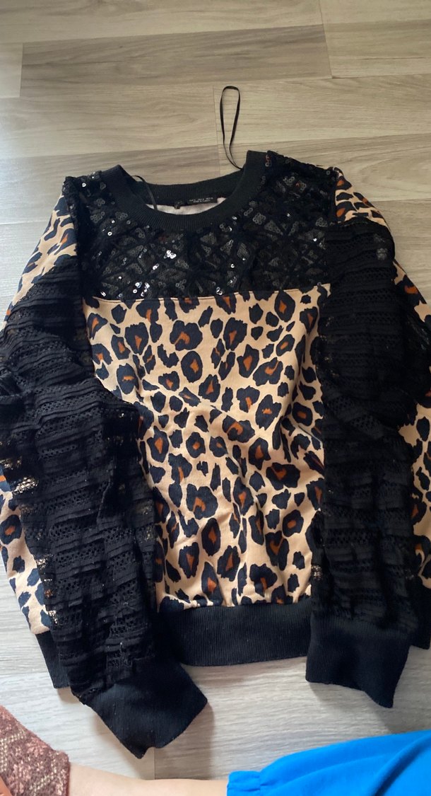 uzun kollu, fırfırlı ve yuvarlak yakalı leopar desenli, siyah dantel detaylı bol kesim bluz. Trend sokak giyimi için uygundur. Bol geniş bir üründür