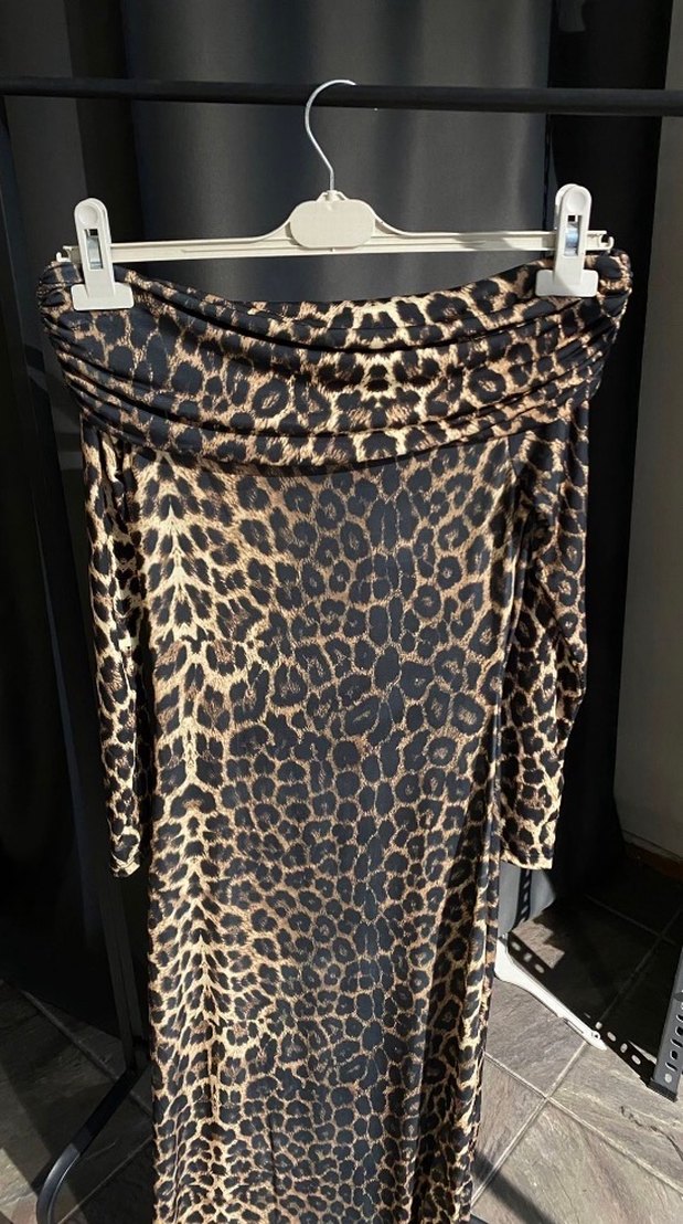 Kadın Leopar Desenli Madonna Yaka Elbise