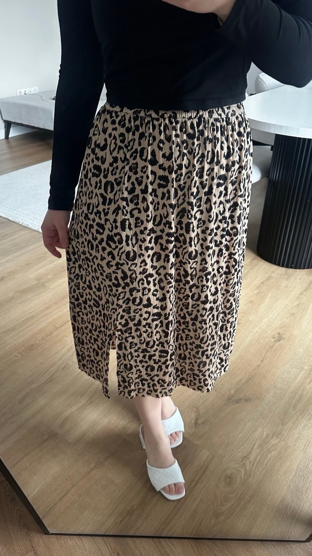 Kadınlar için, hafif kahverengi leopar desenli, pilili ve bol kesim midi etek. Yumuşak sentetik kumaştan üretilmiş, günlük ve rahat sokak stiline uygun.