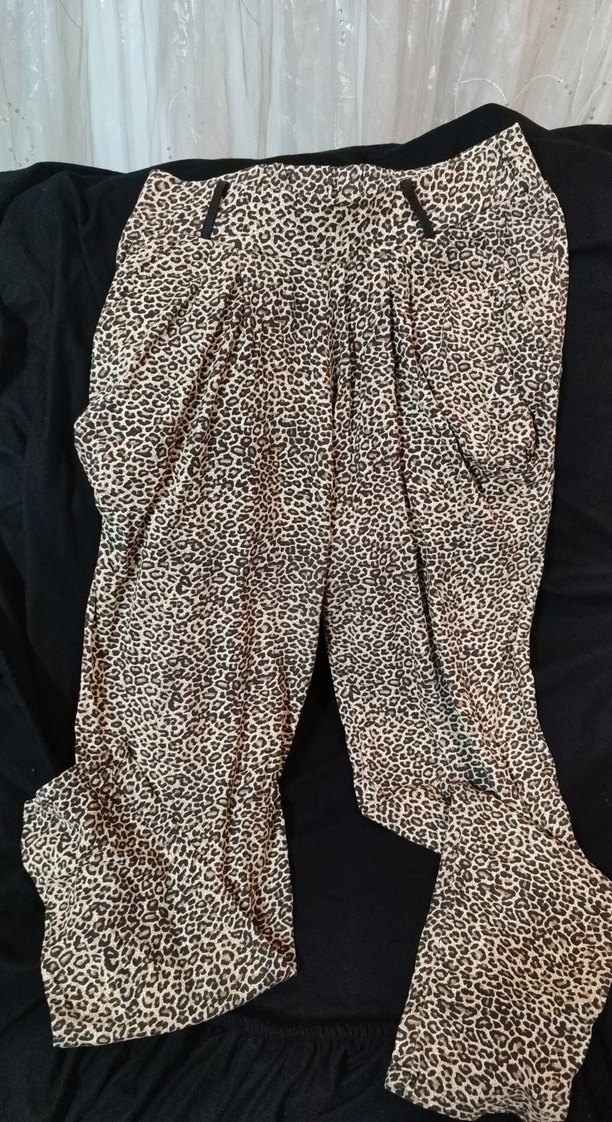 Kadınlar için leopar desenli, drapeli, salaş kesim uzun kumaş pantolon, koyu kahverengi tonlarında, rahat sokak stiline uygun.
