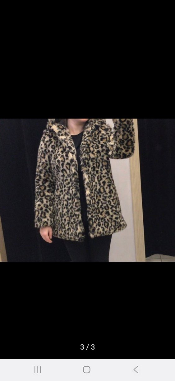 Kadın leopar desenli suni kürk midi mont, uzun kollu ve bol kesimdir. Notlu yaka ve yumuşak, sıcak dokusuyla günlük rahat sokak stili için uygundur.