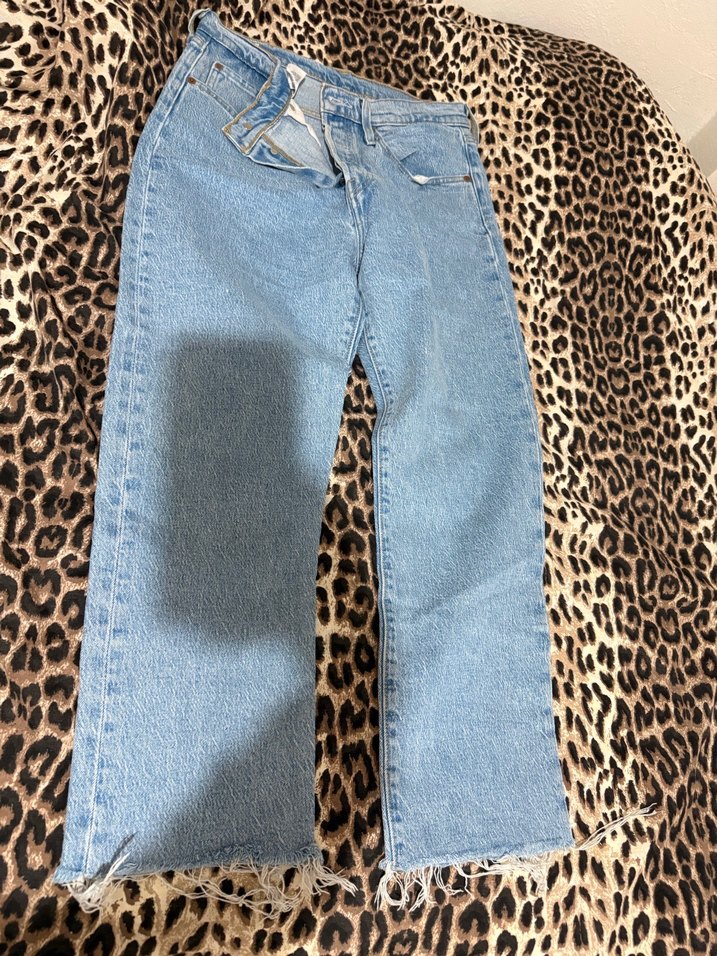 Pastel mavi renkte, midi boy, bol kesim kadın kot pantolon, yumuşak kürk detaylı, günlük rahat sokak stili için uygundur. Orjinal marka Levi’s