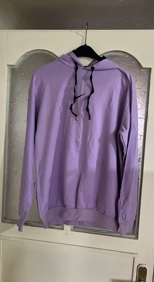 Pastel lila renkte, kapüşonlu, uzun kollu ve bol kesim kadın sweatshirt. Yumuşak ve sıcak kumaştan, günlük kullanıma uygun rahat tasarım.
