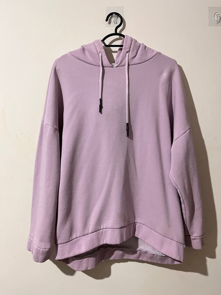 Salaş kesim, uzun kollu lila kapüşonlu sweatshirt, yumuşak ve sıcak kumaştan, rahat sokak stili için uygun.