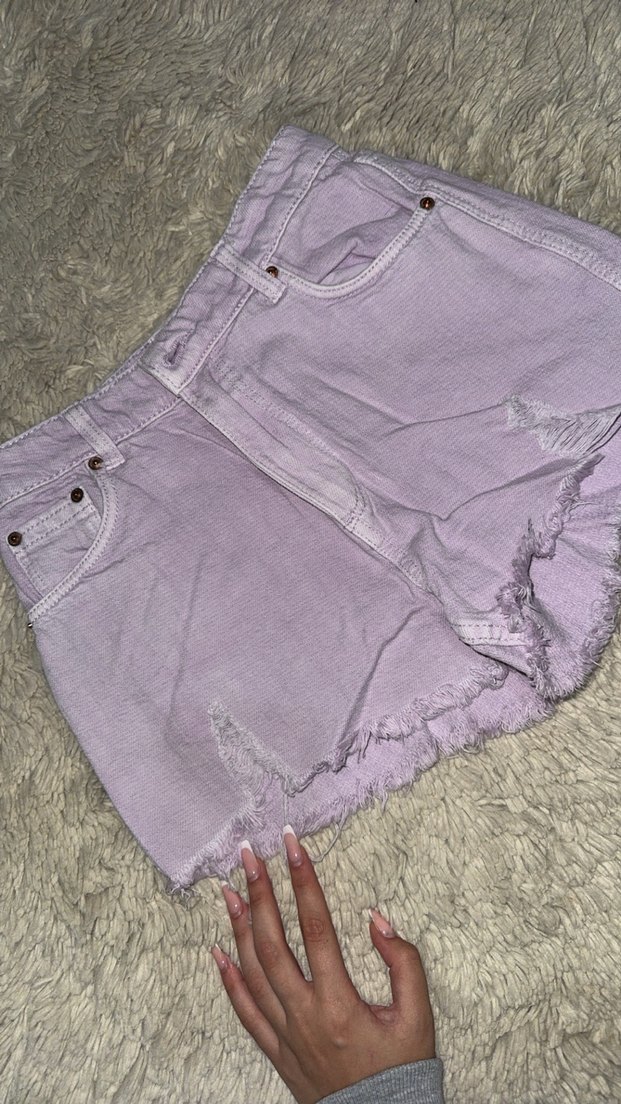 Lila pastel renkli mini jean şort, düğmeli ve bol kesimdir. Rahat sokak stili ve günlük kullanım için uygundur.