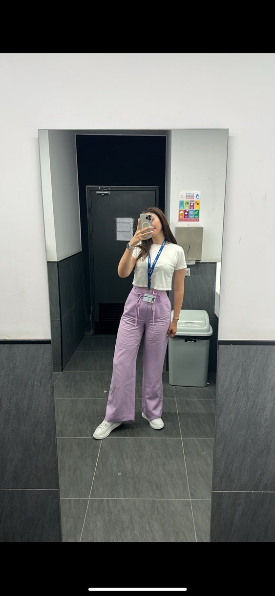 Lila pastel renkte, pamuk kumaştan, bol kesim kadın düz paça pantolon. Günlük kullanıma uygun, rahat ve şık bir seçim.