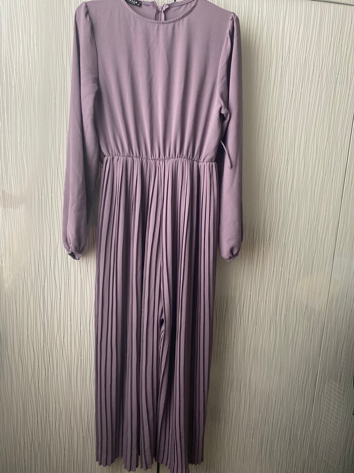 Lila renkte, Pileli elbise görünümlü ve uzun kollu, bol kesim tulum. Yumuşak sentetik kumaştan, yuvarlak yaka ve desensiz tasarım. Bir tane kemer yeri kopuk görselde görüldüğü gibi.Günlük kullanım için ve nişan kına için uygundur.