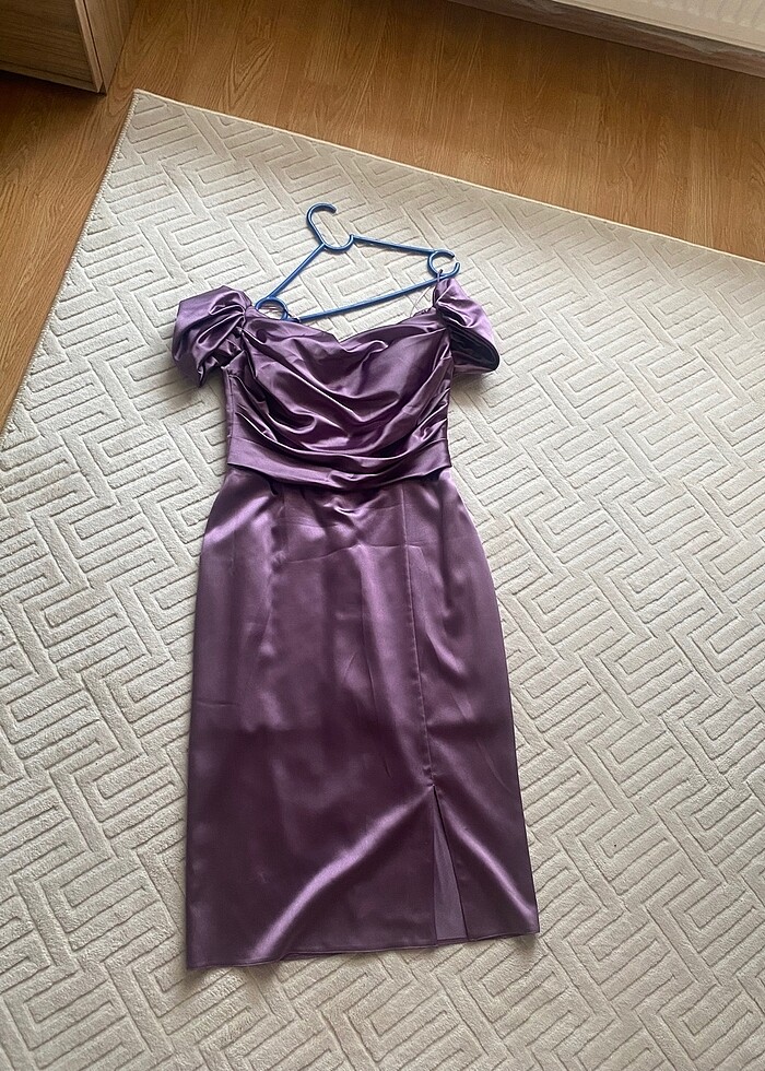 Kadın lila söz nişan elbisesi. Midi boydur. Yırtmaç detayı vardır. 38-40 bedene uyumludur. Ürünü sözümde 2 saatliğine giydim. Marka temsilidir.
