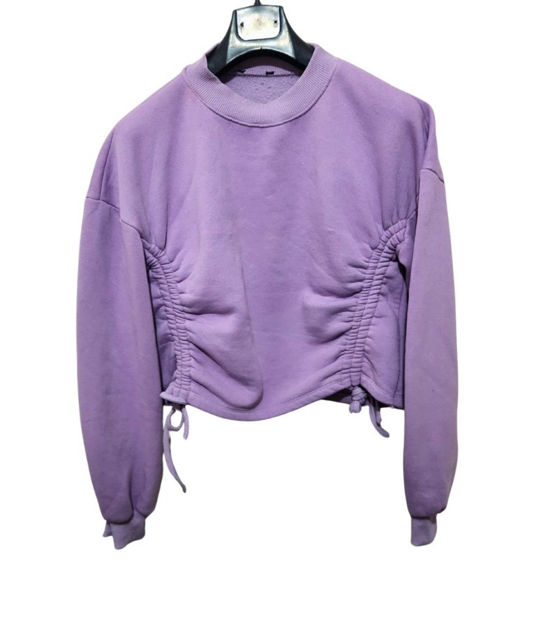 Yumuşak kumaştan, yanları fırfırlı, uzun kollu ve bisiklet yaka, bol kesim lila sweatshirt. Rahat günlük kullanıma uygundur. 55×59