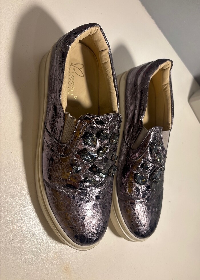 Kadın taşlı loafer ayakkabı hiç giyinmedim ayakkabıcıda demek için ayağıma takmıştım hiçibir defosu yok. Mürdüm yansımalı gümüş fotoğrafta göründüğü gibi bir rengi var.