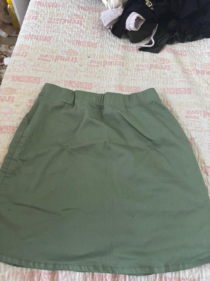 Kadınlar için loose fit midi mini etek, haki renkte, yumuşak sentetik kumaştan, desen içermeyen sade tasarım, günlük rahat kullanım için uygun. Effortless chic tarzı.