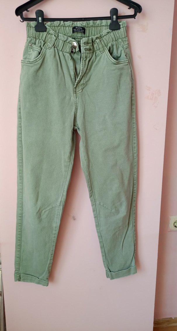 kadınlar için pastel yeşil renkte, loose fit kesime sahip sade ve normcore tarzda denim pantolon, zahmetsiz şıklık sunar.