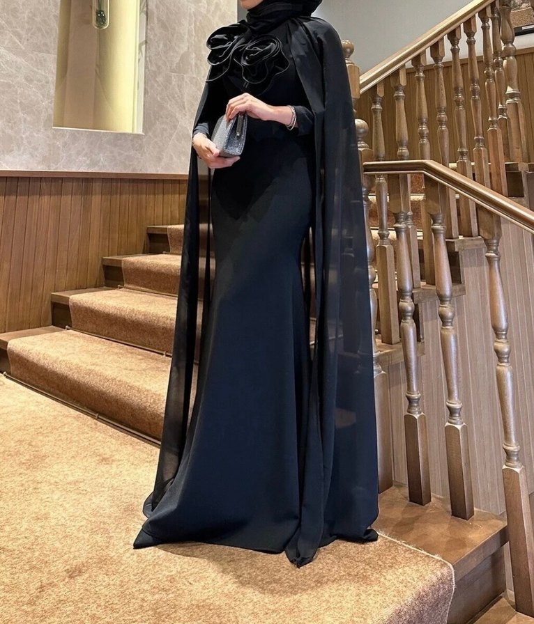 2,3 saat kullanıldı 1 kez . Dar bir model olduğundna dolayı 42 beden de rahat olur Uzun siyah straplez ve uzun kollu, gül detaylı drapeli tarzda abiye elbise. Yaka hakim yaka balık model kumaş tipi dokuma , meratyel krep klasik kesimi ile düğünlere uygun.
