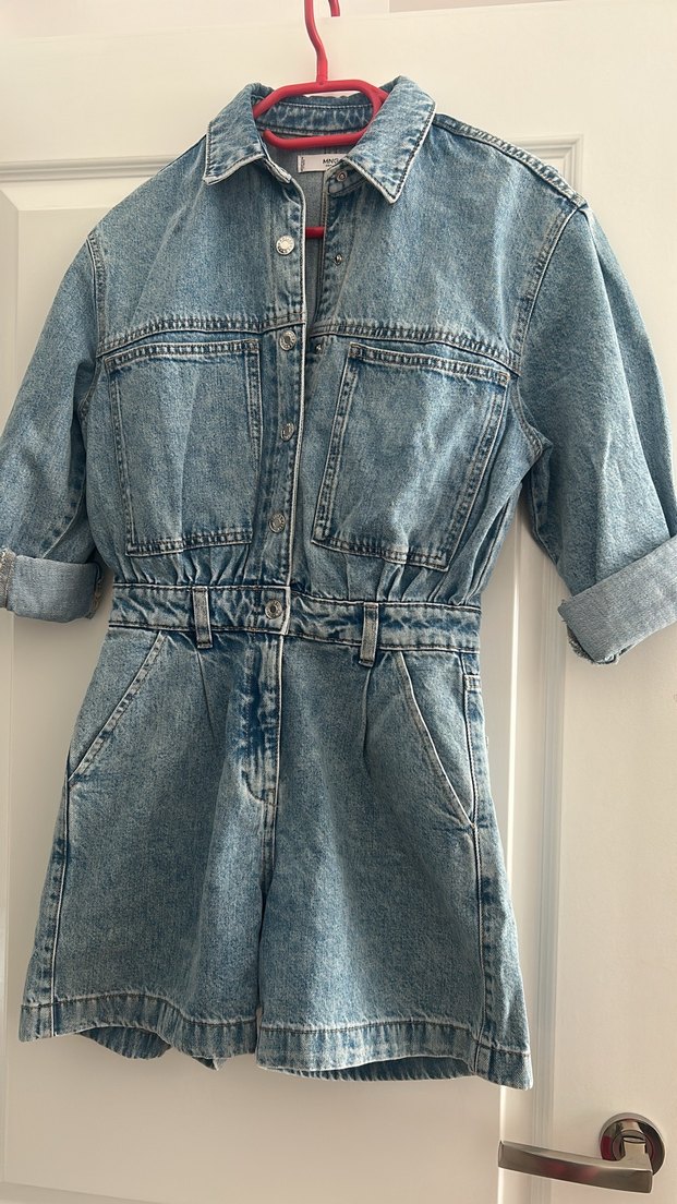 Kadınlar için kısa kollu, kemerli ve vücuda oturan mavi denim tulum. Notlu yakası ve gündelik sokak stili ile midi boyda.