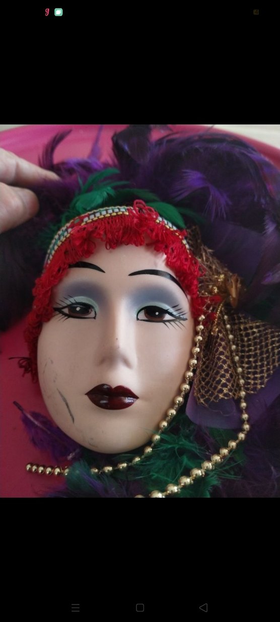 Kadın maskesi, tüy ve boncuk süslemeleri, detaylı makyaj ve narin dantel kenarlarla dikkat çekiyor.