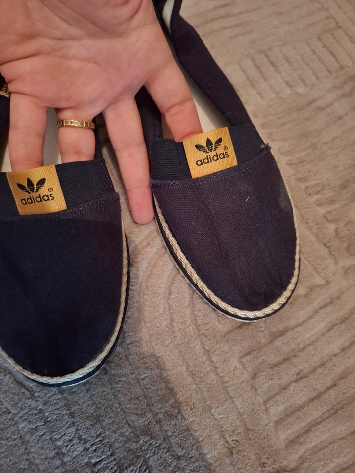 Kadın mavi Adidas espadril, düz kauçuk taban ve kolay kullanım için cırt cırtlı kapama ile. Günlük ve sokak stiline uygun. üzerinde leke var