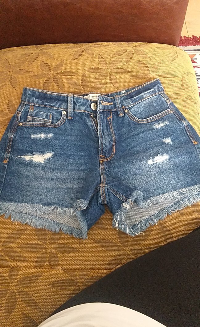 Kadınlar için bağcıklı bel ve yırtık detaylara sahip, koyu mavi tonlarında bol kesim kot şort. Günlük ve sokak tarzına uygun rahat tasarım.