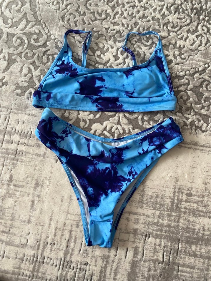 Kadınlar için bağlama desenli koyu mavi, dantel detaylı, ince askılı ve vücuda oturan bikini takımıdır. Shein marka.