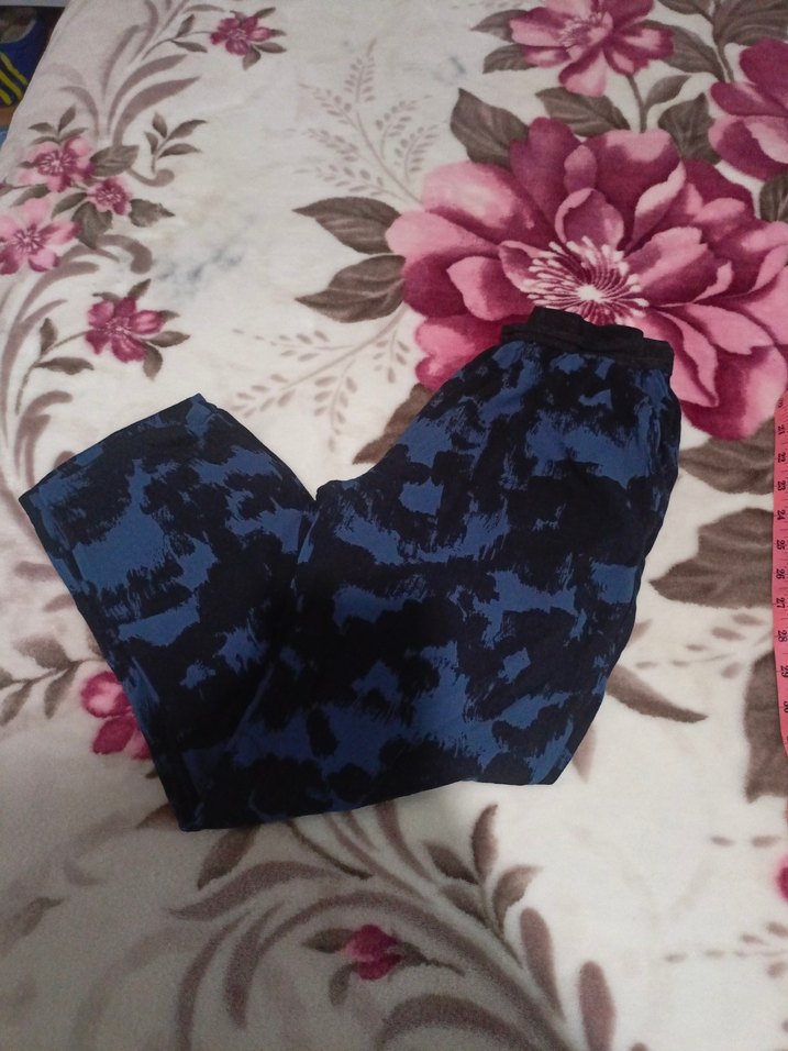 Kadınlar için koyu mavi bağlama desenli, salaş kesim ve fırfırlı detaylı pantolon. Yumuşak sentetik kumaştan, günlük kullanıma uygun rahat ve trend tarz. boyu 81 cm bi bacağına boya degmiş sanırım ama aynı renk tonlarında çok dikkat çekici durmuyor fotolarda belirttim fiyatını ondan uygun koyuyorum