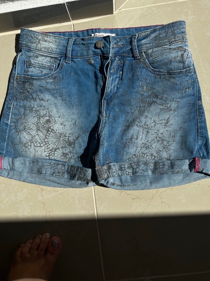 Kadınlar için bol kesim, mavi renkli, gri bağlamalı desenli ve tokalı mini denim şort, açık hava için uygundur.