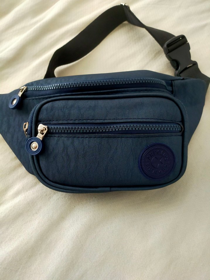 Kadınlar için belden takılan, sentetik kumaştan yapılmış mavi baskılı çanta. Renkli desenleriyle trend sokak ve athleisure tarzına uygundur. Günlük kullanım için idealdir.