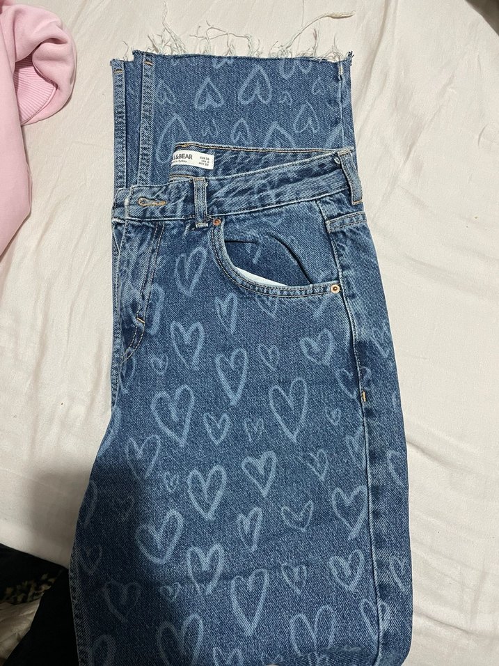 Mavi denim pantolon, kalp desenli baskılı ve tokalı detaylı. Normal kesim, midi boy, günlük rahat kullanım için uygundur.