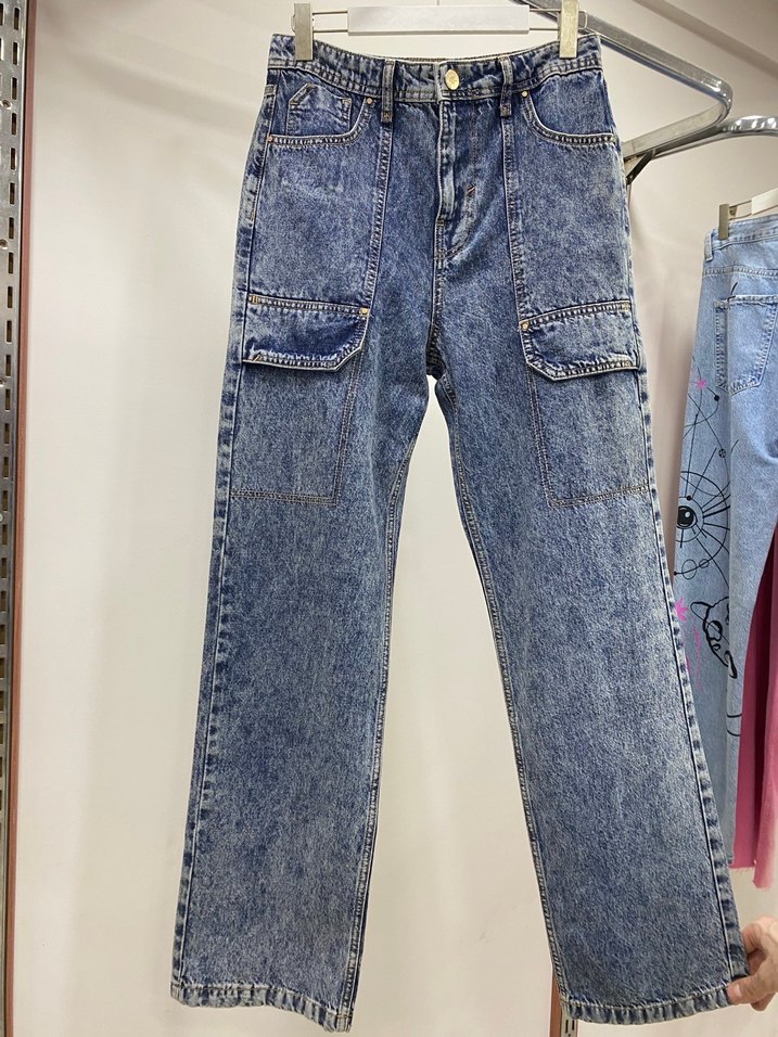 Bu açık mavi kot pantolon, bol kesim ve kemerli bel detayına sahip. Batik desenli, midi boy ve kullanışlı ön ceplerle günlük rahatlığa uygun.