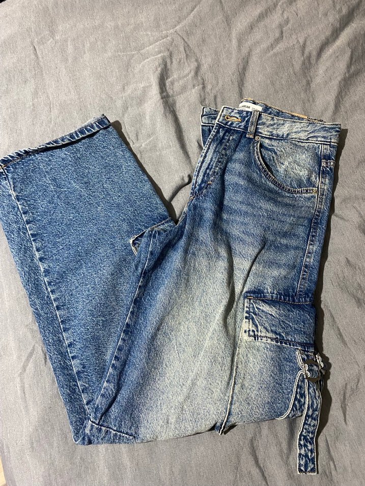 Kadınlar için bol kesim, mavi batik desenli kot pantolon. Denim kumaştan, normal midi boyda ve tokalı detaylarla günlük kullanıma uygun.