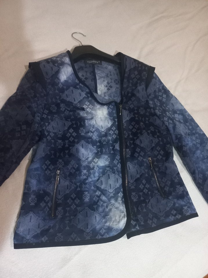 Kadınlar için koyu mavi batik desenli denim ceket, kesik yaka ve uzun kollu. Normal kesim, fermuarlı ceplerle günlük sokak stiline uygun.