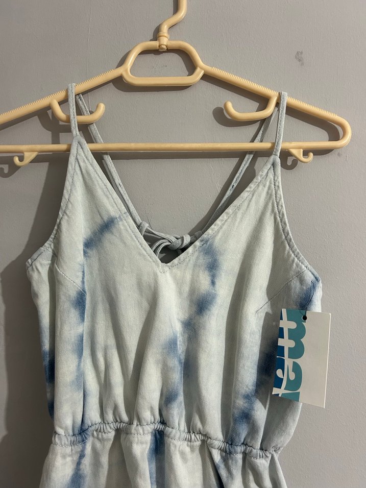 V yaka ve ince askılı, mavi batik desenli, bol kesim elbise. Sırtı açık ve bağlamalı hiç giyilmedi
