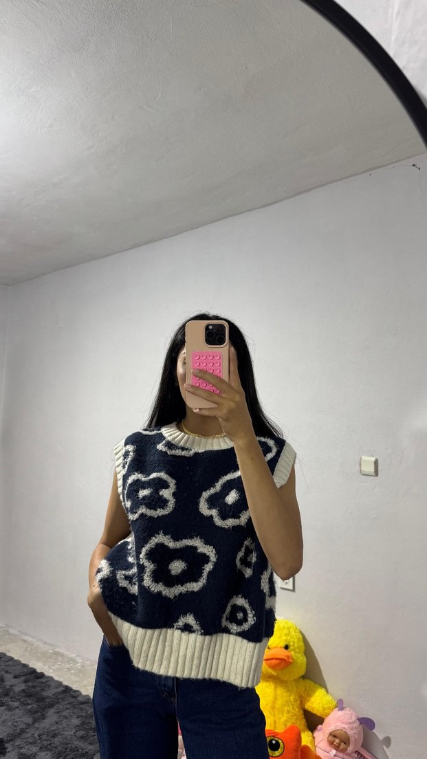 Kadın mavi Batik Desenli Kolsuz Triko Süveter