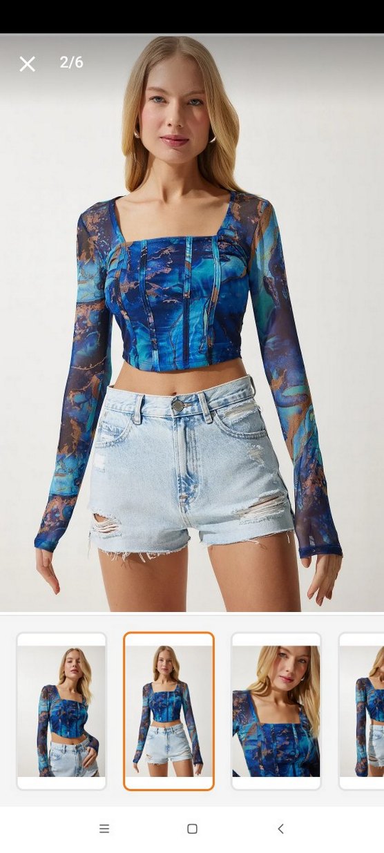 Dar kesim, askısız ve uzun kollu, koyu mavi batik desenli, tokalı detaylara sahip denim görünümlü bluz. Günlük sokak stili için uygun.