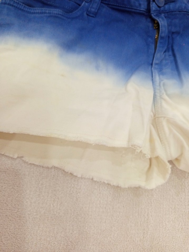 Kadınlar için pamuklu, mavi pastel batik desenli, volan detaylı ve bol kesim midi uzunluğunda denim şort. Rahat sokak stili için uygundur.