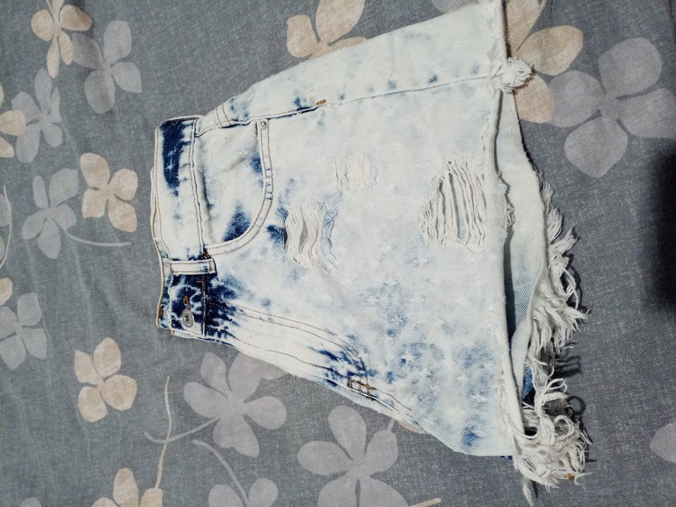 Mavi batik desenli, bol kesim mini denim şort, düğmeli ve yırtık detaylı, günlük sokak stili için uygun.